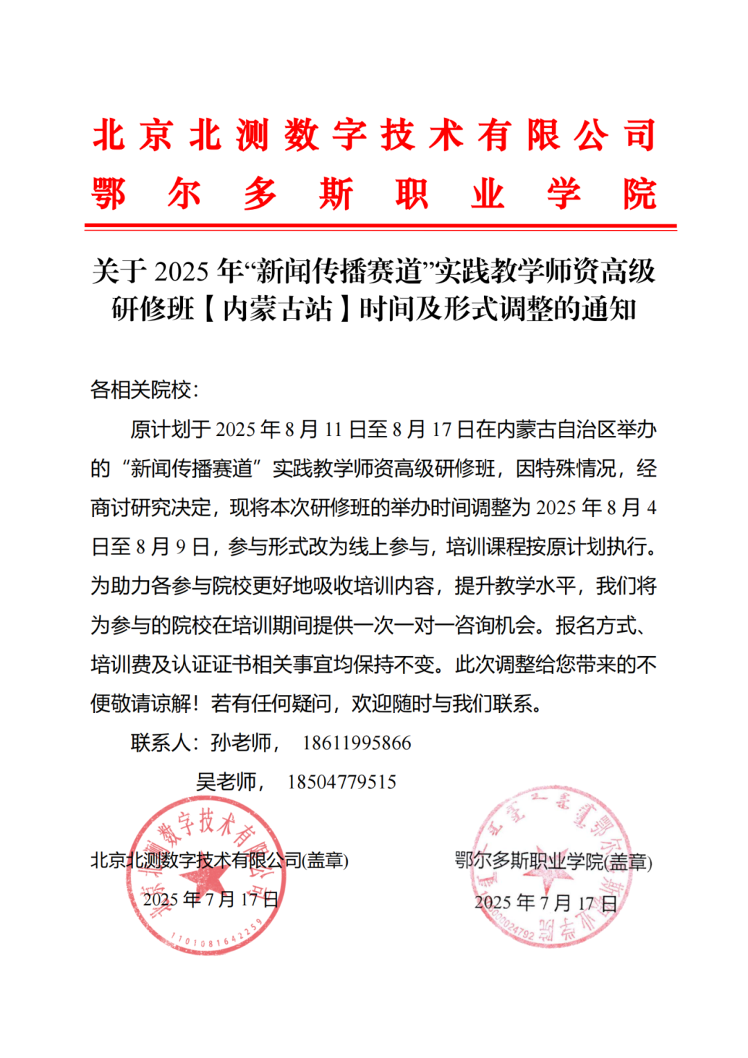 关于2025年“新闻传播赛道”实践教学师资高级研修班【内蒙古站】时间及形式调整的通知